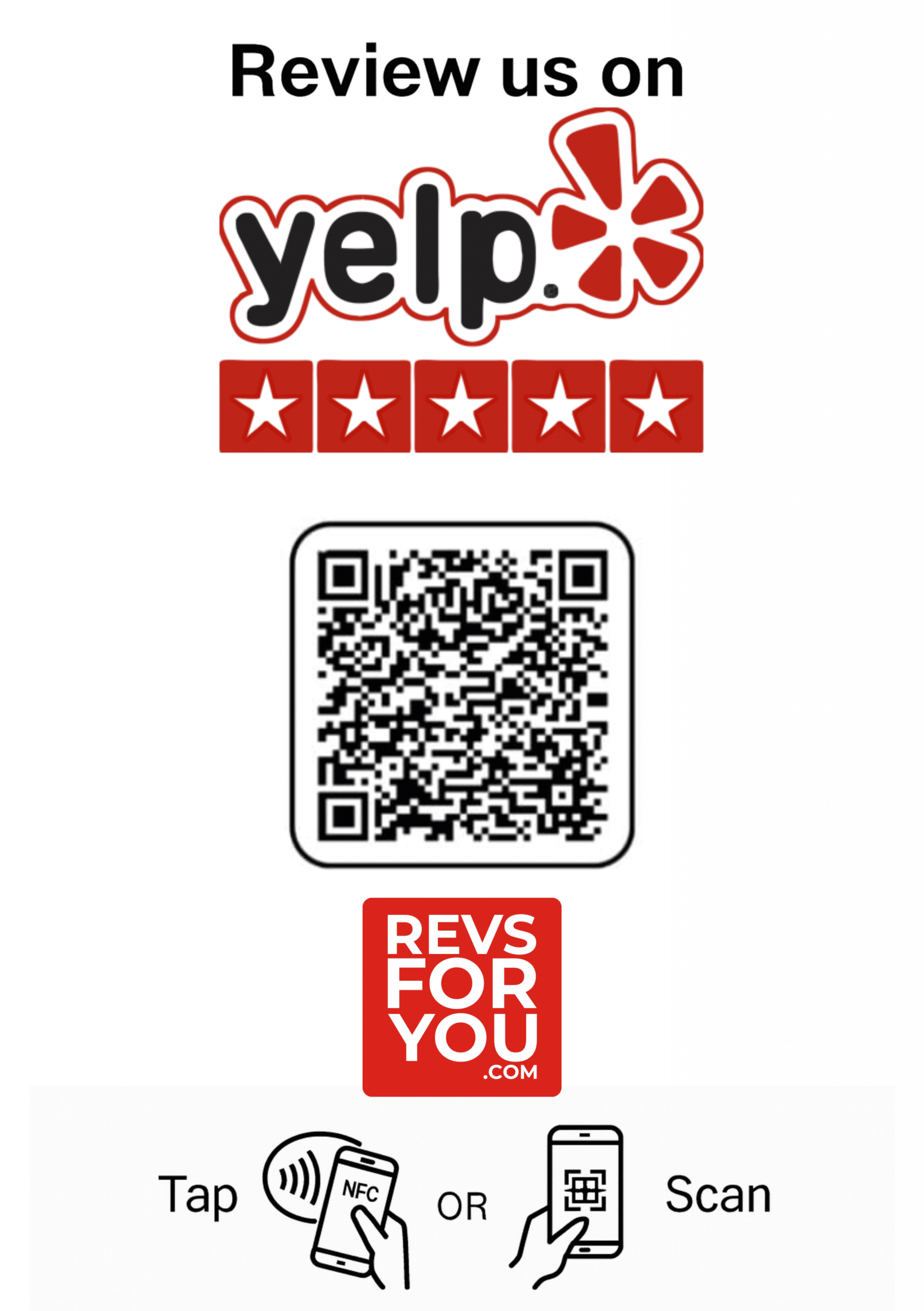 El Cartel NFC + QR Adhesivo Inteligente Yelp Reviews de Revs For You está diseñado para que tus clientes