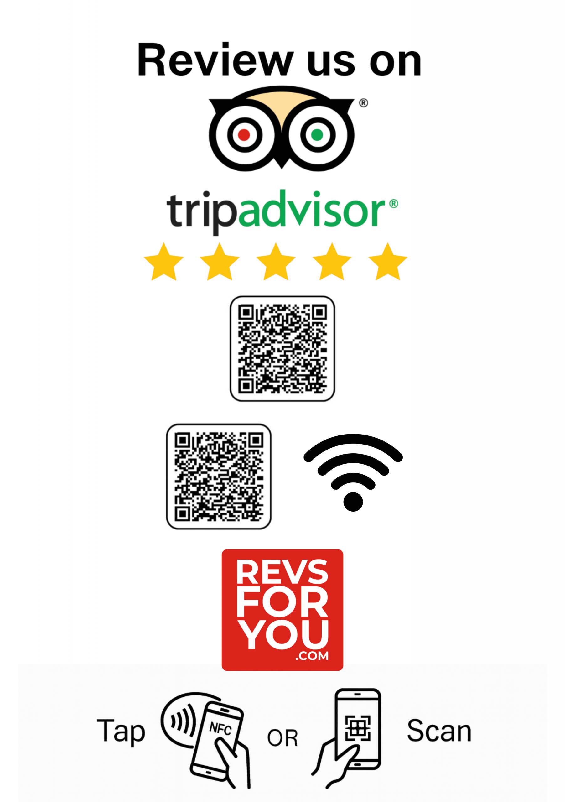 El Cartel NFC + QR Doble Adhesivo Inteligente TripAdvisor + WiFi de Revs For You permite que tus clientes