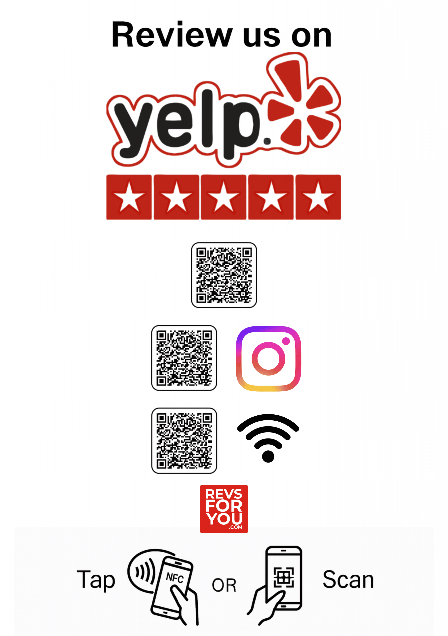 Cartel NFC + QR Triple Adhesivo Inteligente Yelp + Instagram + WiFi — Revs For You