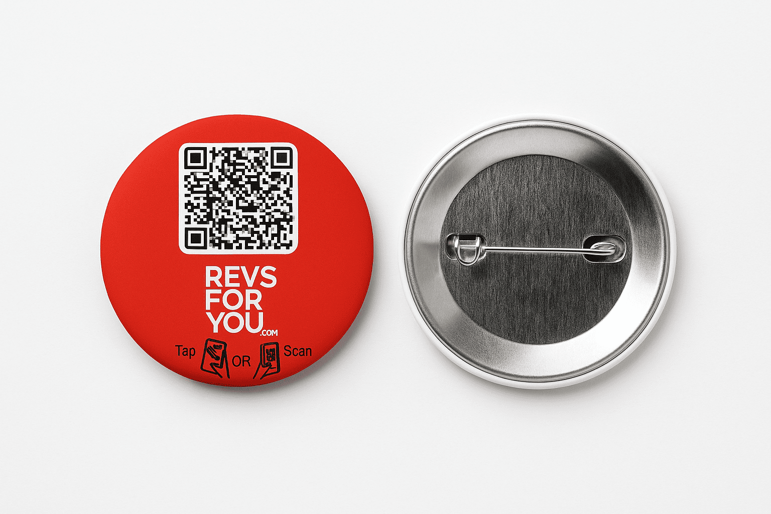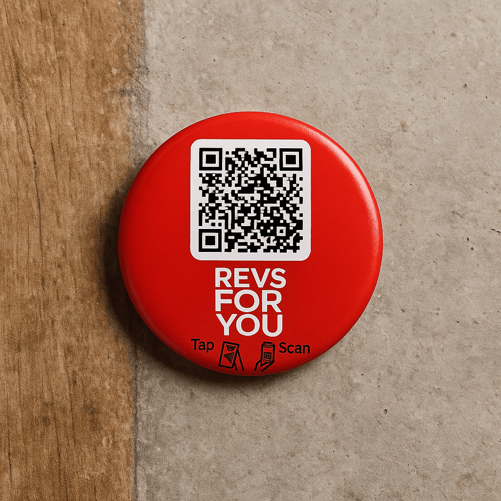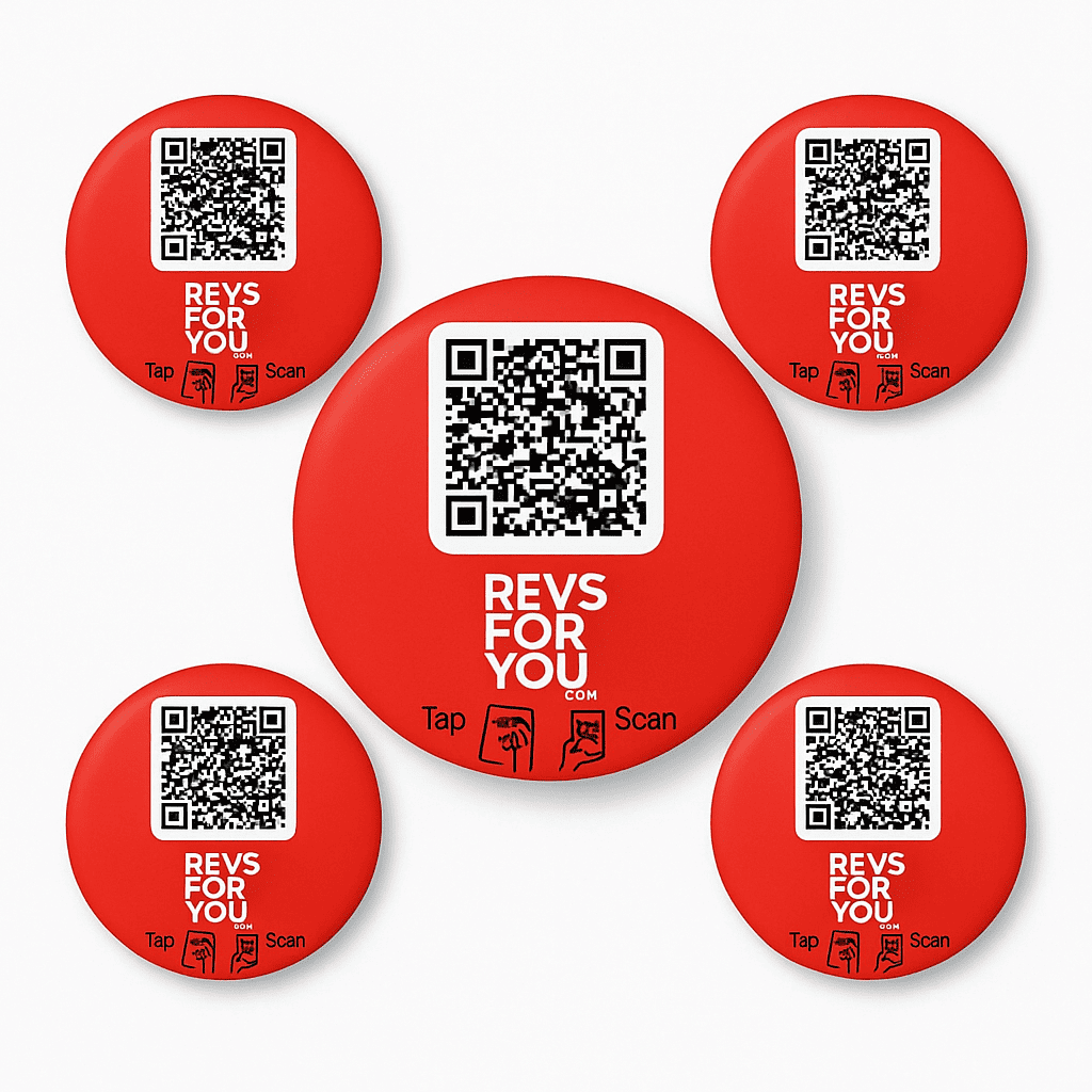 La Insignia Roja NFC + QR Inteligente de Revs For You está diseñada para que cualquier profesional o negocio pueda compartir su perfil de reseñas o redes sociales de forma inmediata.